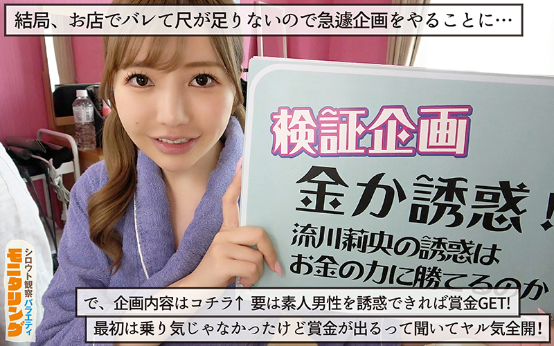 都内某DVDショップでエロなしの健全な販促活動をすることになった莉央ちゃん。以前、店内で無茶苦茶やらかしてエロ厳禁になってしまった経緯があり故に今回は絶対に店内でのエロ行為は無しでと釘を刺されてしまった。完全不利な状況下での販促活動になってしまった莉央ちゃん。だが持ち前の明るさでお客さんに声掛け勧誘開始!「買ってくれたらなんかいいことあるでぇ」とお客さんをお店の奥へ。「バレたら莉央が怒られちゃうから」なんて言いながら手早くお客さんの服を脱がしておち○ぽシコシコ!「めっちゃ硬くなってるやん」ってニコニコしながらお口でシコシコ!絶妙な舌使いと焦らしで緩急つけてそのままドッピュン大成功!舌も乾かぬうちに次のお客様をお店の奥へご案内!女体を舐めるのが大好きというお客様には顔騎の大サービス!溢れるマン汁をご提供!「せっかくだから舐め合いっこしよっか」と69を敢行!思った以上に気持ち良くなってしまった莉央ちゃんはお客さんのイキリ勃ったチ○ポを生でマ○コへイン!エロテク全開でお客様をおもてなし!エロ行為禁止されてるハズなのに何度もイキまくった挙句、最後はお客さんのザーメンをマ○コでキャッチイン!めでたしめでたし!販促活動大成功って喜んだのも束の間、なんと監督より尺が足りませんとのこと。仕方なく次の企画をやる羽目に。イヤイヤフリップを見てみると「検証企画 金か誘惑!流川莉央の誘惑はお金の力に勝てるのか?」と書いてあった。ピンときていない莉央ちゃんに監督から勝ったら賞金が出ると聞き「やるぅ〜」と一気に前のめりに!スタッフが対戦相手の素人男性を用意している間に勝手にエロコスに着替えてやる気満々の莉央ちゃん!しかも対戦相手がイケメンなのを見て俄然ヤル気アップ!甘ったるい関西弁で執拗に迫る莉央ちゃんに最初こそ平静を装っていたイケメン素人さんも徐々に莉央ちゃんに飲み込まれてゆく。莉央ちゃんのおっきいお尻を触らせてあげたくらいからイケメン素人さんに変化が…。「セックスしたいです…」ついに言わせた!莉央ちゃん完全勝利のご褒美セックスに突入!スローリーな舐めと淫靡な関西弁でビンビンになったオチ○ポをお口でシコシコ…そのままドッピュン!「あ…出ちゃった…」挿入前に暴発して強制終了。またまた違うエロコスに着替えて準備万端な莉央ちゃんに2人目のシロウト男性を投入!メガネの真面目そうな男性で難易度高そう…なんて思う間もなくベロチュウの先制攻撃!関西弁でいやらしい言葉を投げかけられチ○ポは早くもビンビン!でも賞金が欲しいから必死で我慢するシロウト男性を尻目にエロの波状攻撃!顔騎しながらチ○ポをシコシコ!どエロい舌で亀頭をチロチロ!もう辛抱たまらんとばかりに「セックスしたいです!」と晴れやかに宣誓!盛った動物のように莉央ちゃんに生でチ○ポぶっ込んで腰をフリフリ!ヨガる莉央ちゃんにさらに興奮したシロウト男性は中で暴発!しかし萎えないチ○ポで次から次に莉央ちゃんのマ○コに射精大会!とんでもないシロウト男性にイッてイカされ企画大成功と相成りました!