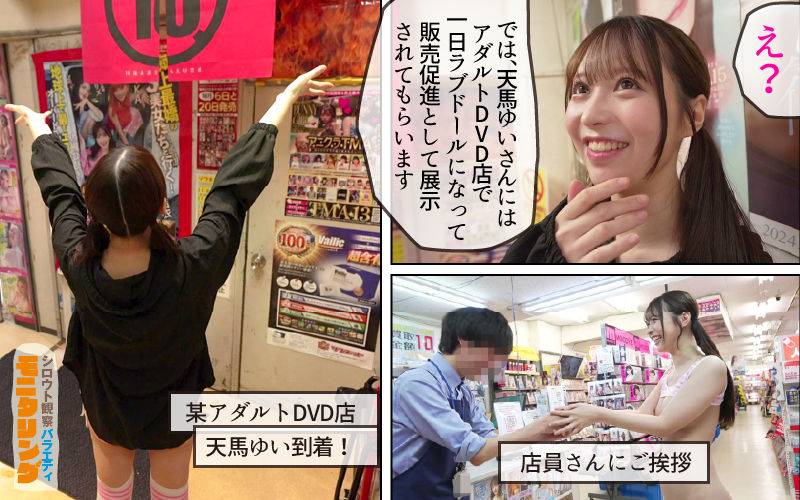天までイっちゃえ!天馬ゆいがリアルDVDショップに大潜入!おっぱい丸出しで店舗見学、そしてリアルラブドールに扮した天馬ゆいが展示中!?その様子をこっそりモニタリング!お客さんに見られまくり恥ずかしすぎて悶絶のゆいちゃん。DVD購入者の大量のチ●ポをベロッベロして口内発射&おっぱいぶっかけ!待望のチ●ポ挿入でおしゃべりしながらの喘ぎ声がなんともエロい!騎乗位サービスで3P中出しした大量の精子がドロ~リ!さらには顔射からの追い打ち射精!!